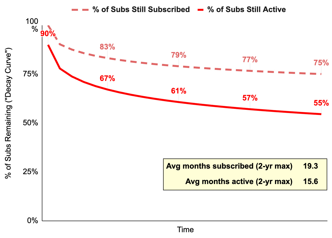 Let's assume Big Dean's retention follows a similar trend. The image below shows how many of BD's subscribers remain on the email list after two years (i.e., those that do not unsubscribe) and how many are still actively engaging with the newsletter.