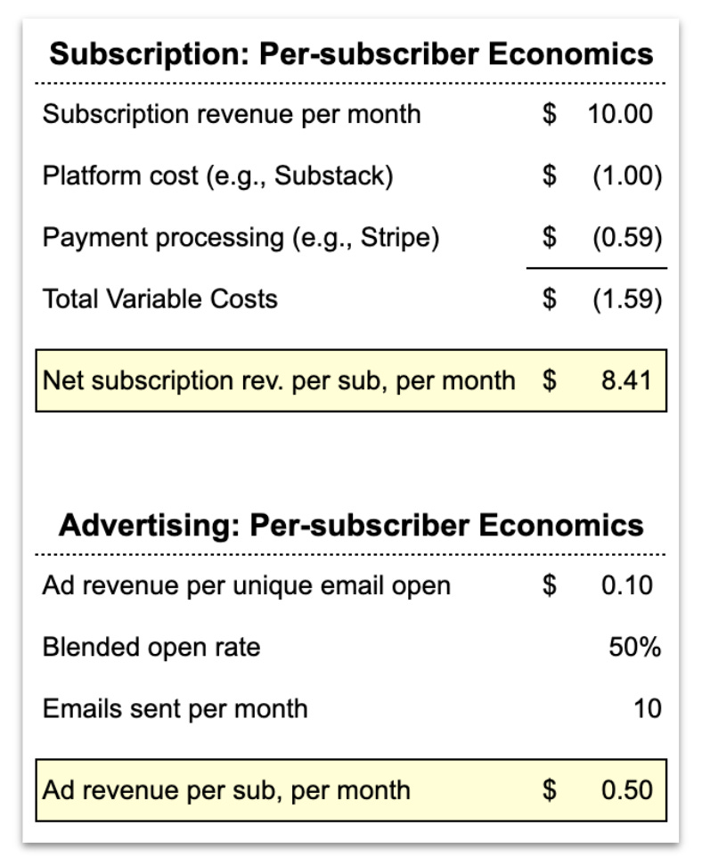 While we’re here, let’s highlight one key difference between advertising and subscriptions. In nearly every case, advertising revenue is based on engagement, either directly (e.g., cost per open or click) or indirectly (e.g., flat fee based on expected engagement). As such, having less-engaged or dormant subscribers choose to unsubscribe has little to no impact on advertising revenue. Paid subscriptions are quite different: we lose the same amount regardless of each paid sub’s engagement.3