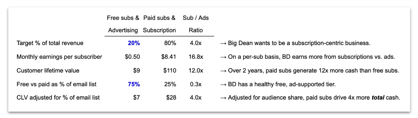 We can adjust our CLV (a per-subscriber metric) based on audience share to gauge our total revenue mix. Currently, 75% of BD’s email list are free subscribers — for every paid subscriber, there are three free, ad-supported subscribers. After adjusting CLV based on audience share, we expect paid subscriptions to drive 4x more total revenue than advertising, which maps nicely to BD’s desired revenue mix (80% subscription vs. 20% advertising).